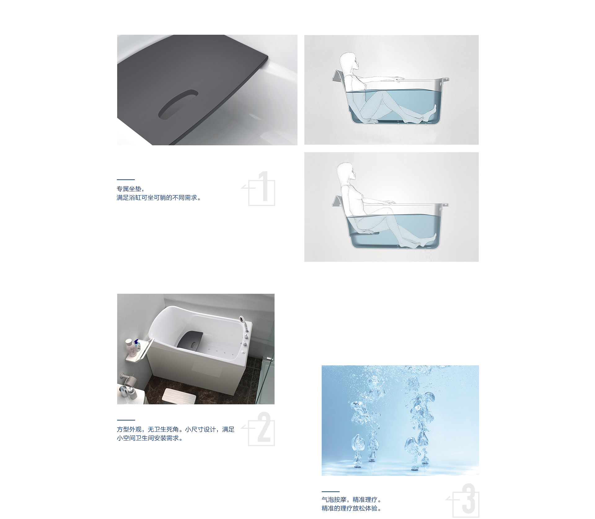 水療獨立按摩系統(tǒng)、勁速沖浪按摩系統(tǒng)、微泡泡按摩系統(tǒng)及汽泡按摩系統(tǒng)四件模式供你選擇,讓你隨心所浴,樂享水悅生活