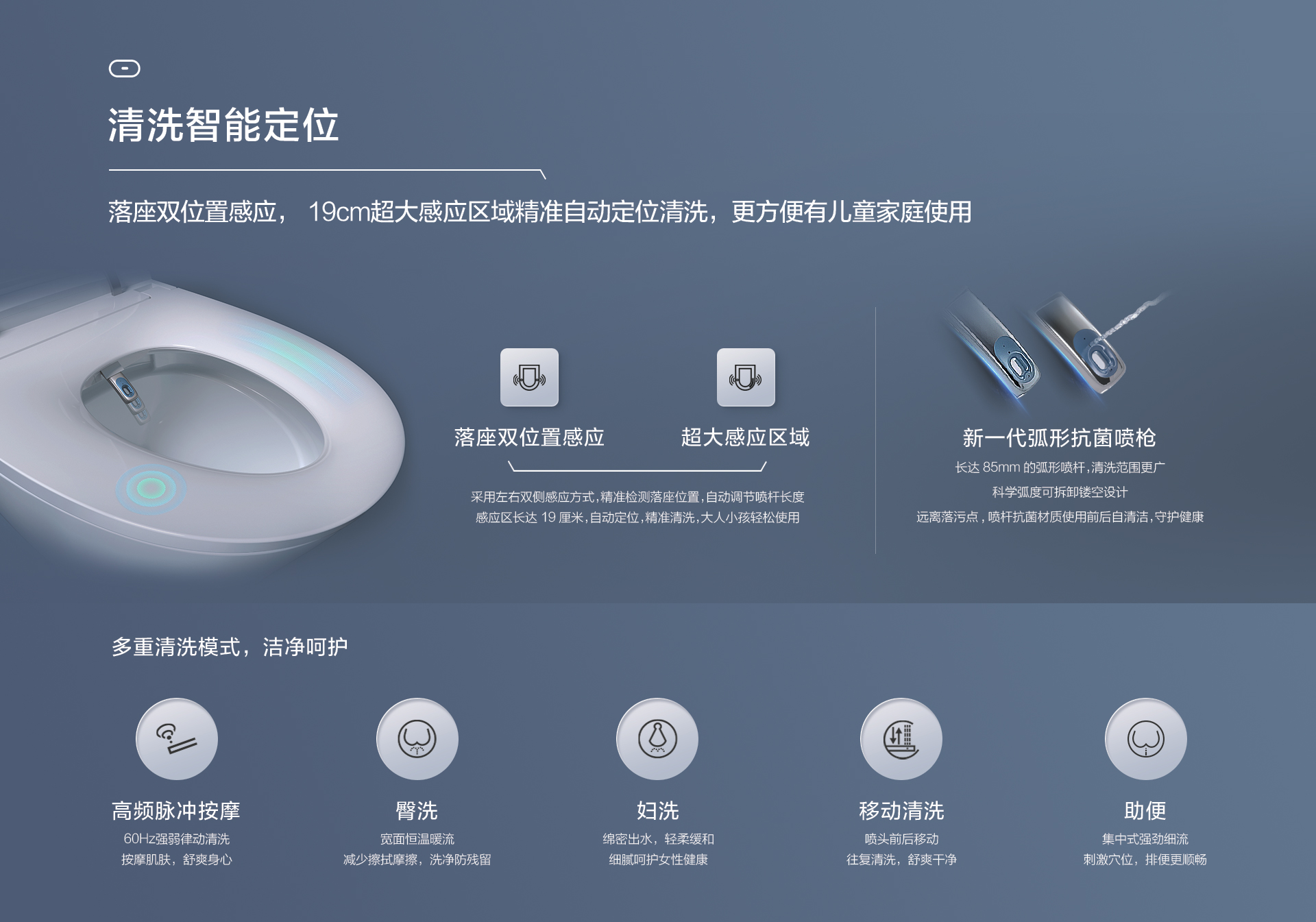 清洗智能定位:落座雙位置感應,19cm超大感應區域,精準自動定位清洗,更方便有兒童家庭使用